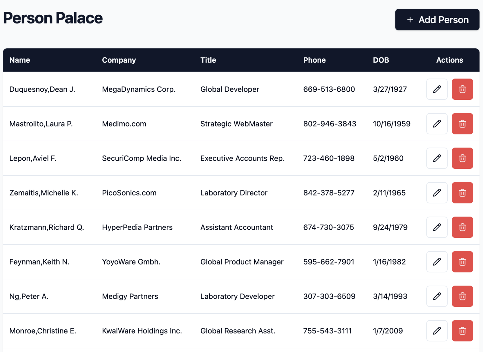 Please create a modern, convenient UI vs. the following open API spec, which will allow list, create, update, and delete persons { "swagger":"2.0", "info":{ "title":"Person API," "version":"1.0.0" }, .... the whole swagger spec.